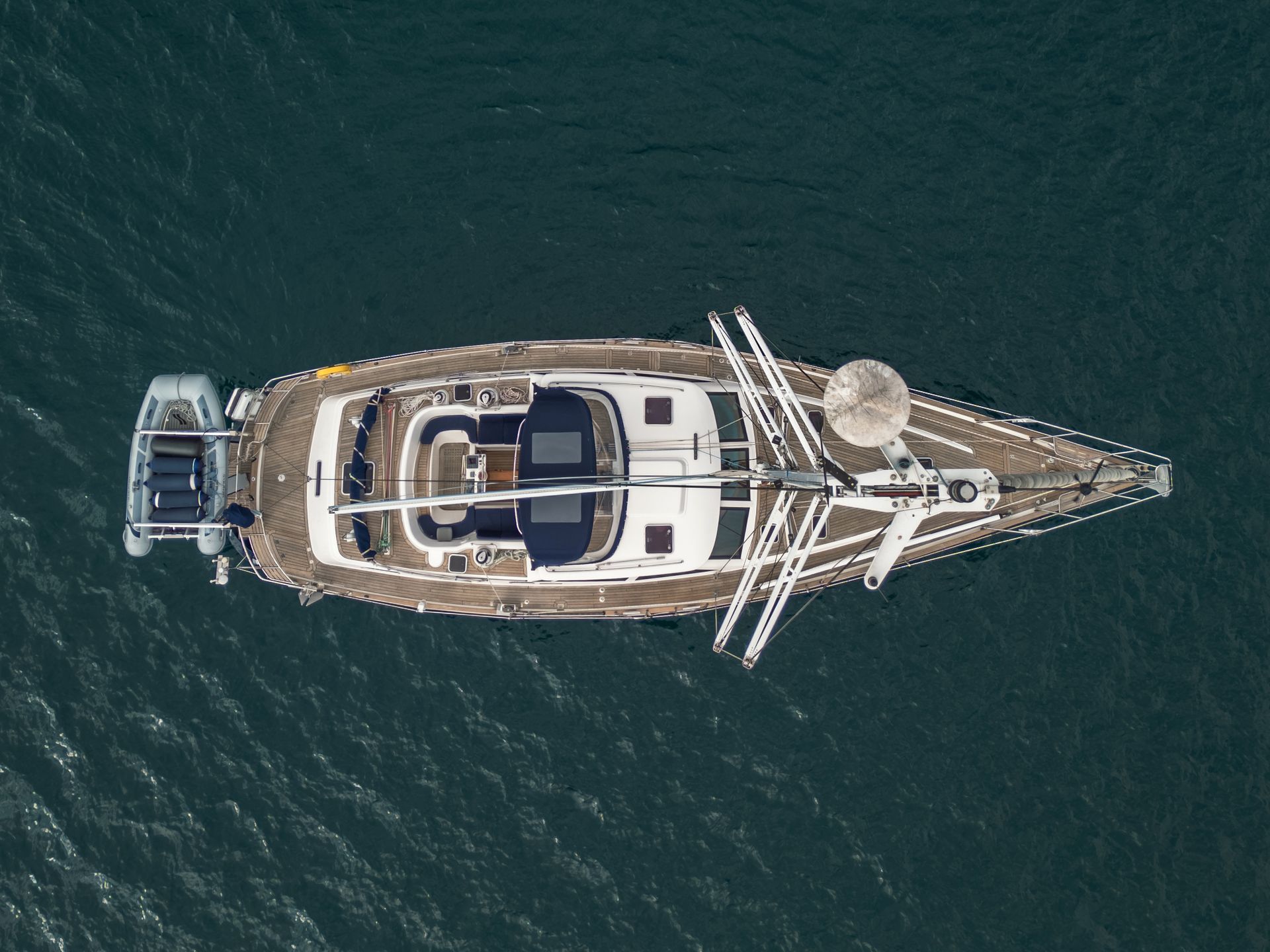 Entering the cockpit, you immediately notice the extensive helm station, leaving no doubt that this yacht is designed for effortless control. Electric winches are mounted on port and starboard for the foresails, while a central electric winch is fitted for the mainsail. The cockpit is well protected and offers space for dining or relaxing under the bimini, with clear views all around. Moving forward along the wide teak side decks, the sense of durability and seaworthiness is immediately apparent from the high-quality stainless steel hardware. The foredeck provides ample working space around the windlass and ground tackle, as well as additional lounging areas.