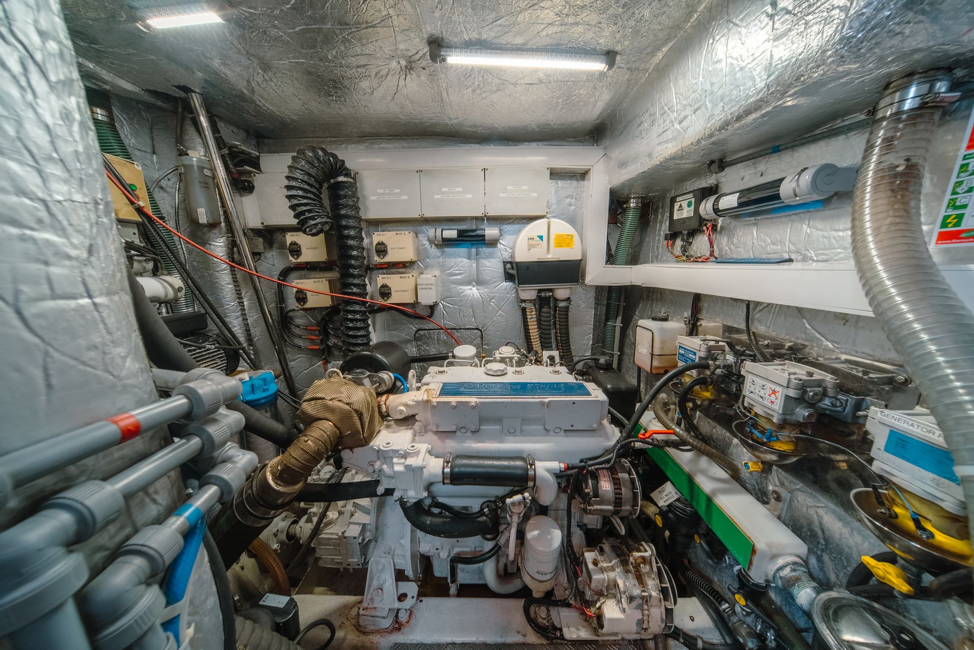 Engine access is excellent, with a dedicated walk-in engine room accessible through the bathroom, providing straightforward access to the main engine, generator, and technical systems.