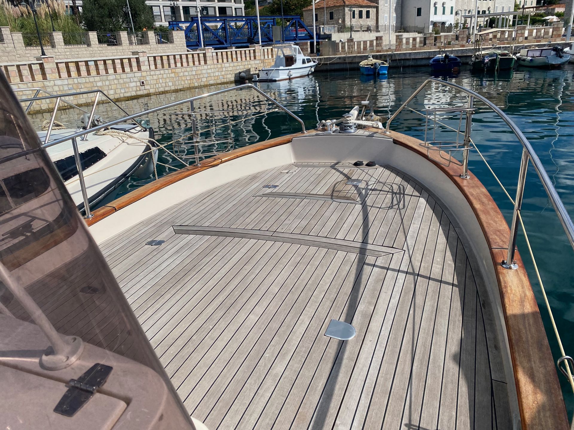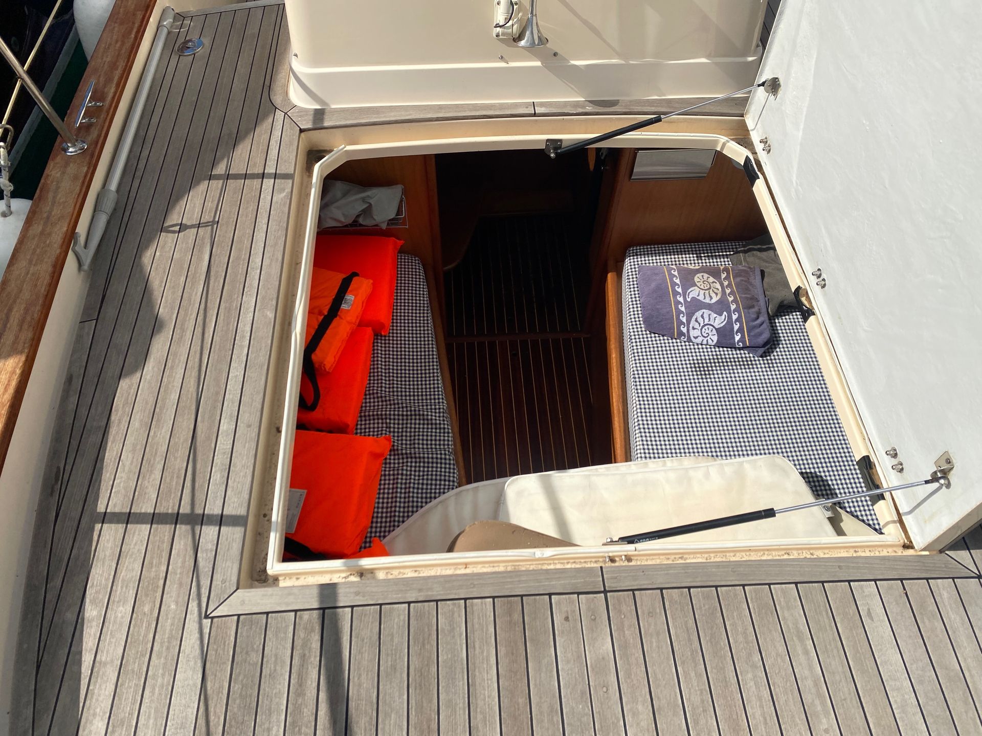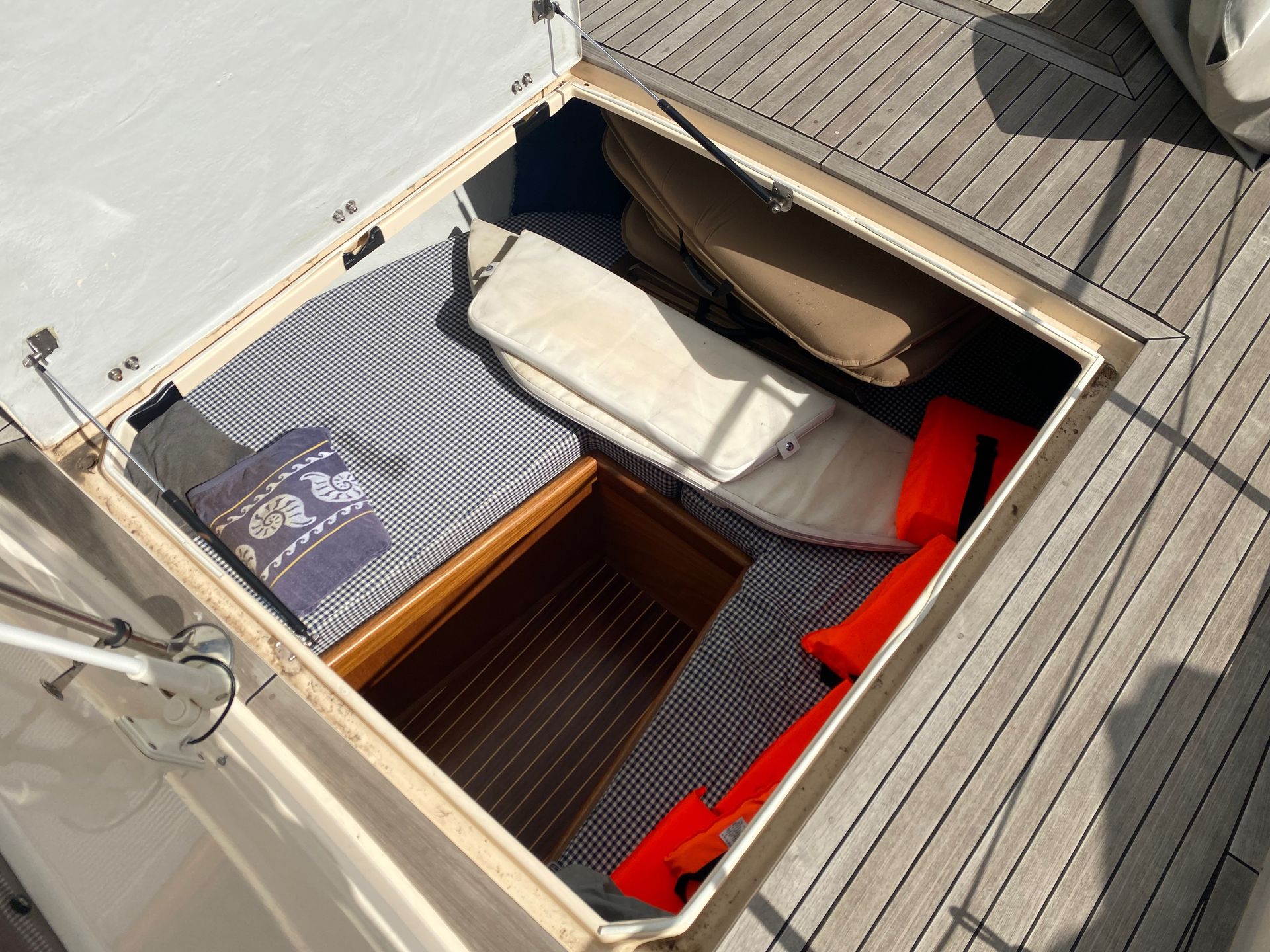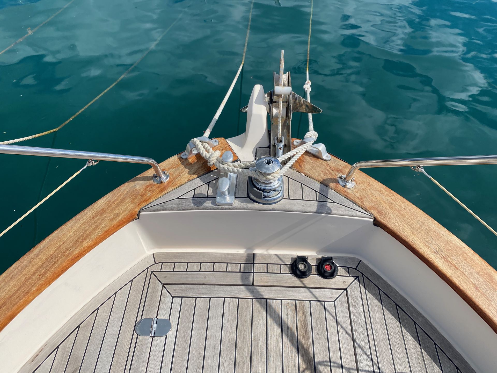 Powered by a reliable 125 hp Yanmar diesel, it combines strong performance with economical cruising. The deck layout offers a comfortable seating arrangement in the aft cockpit, while the flush full-teak foredeck can be covered with cushions, creating the perfect space to enjoy the sun.