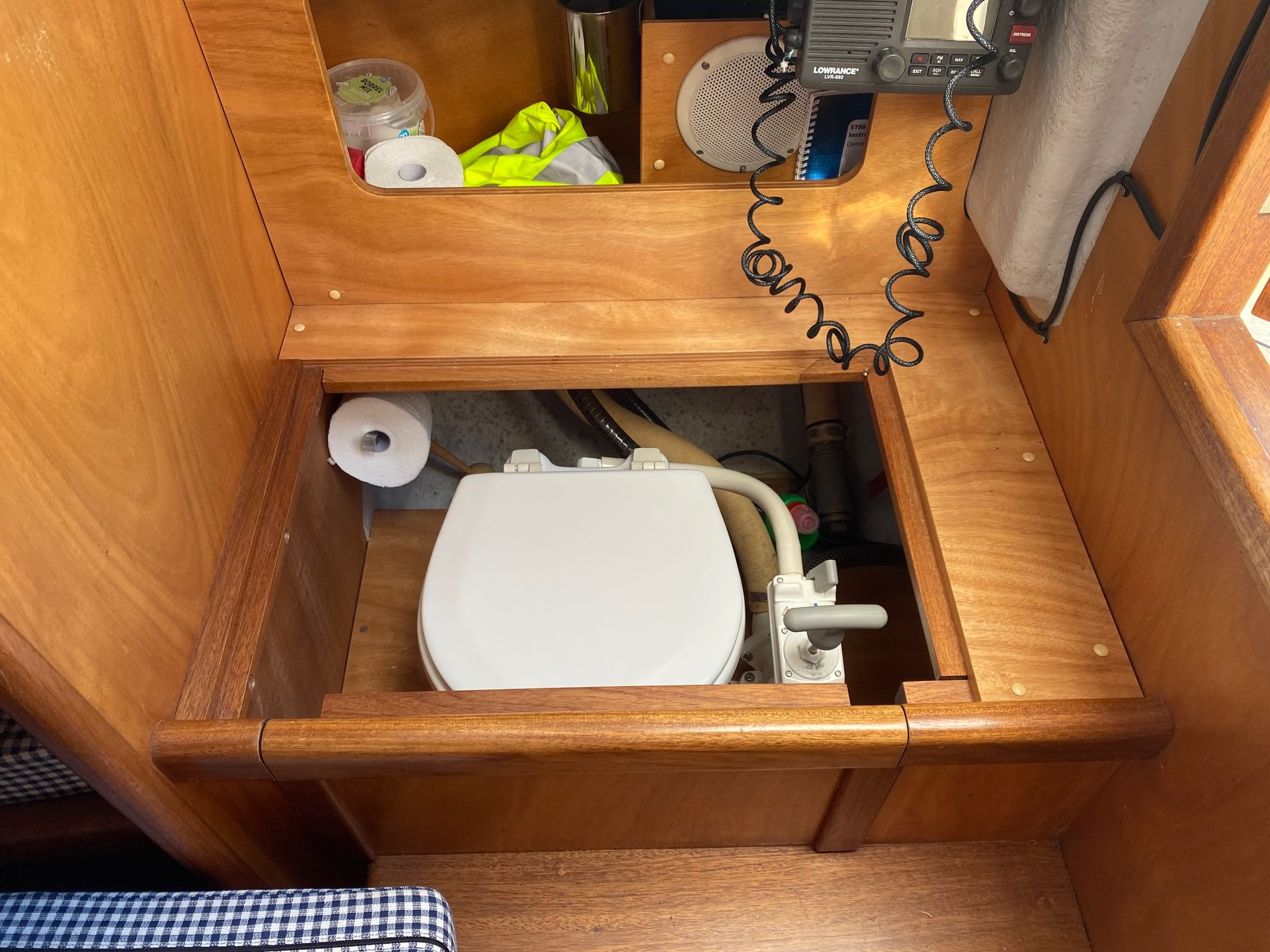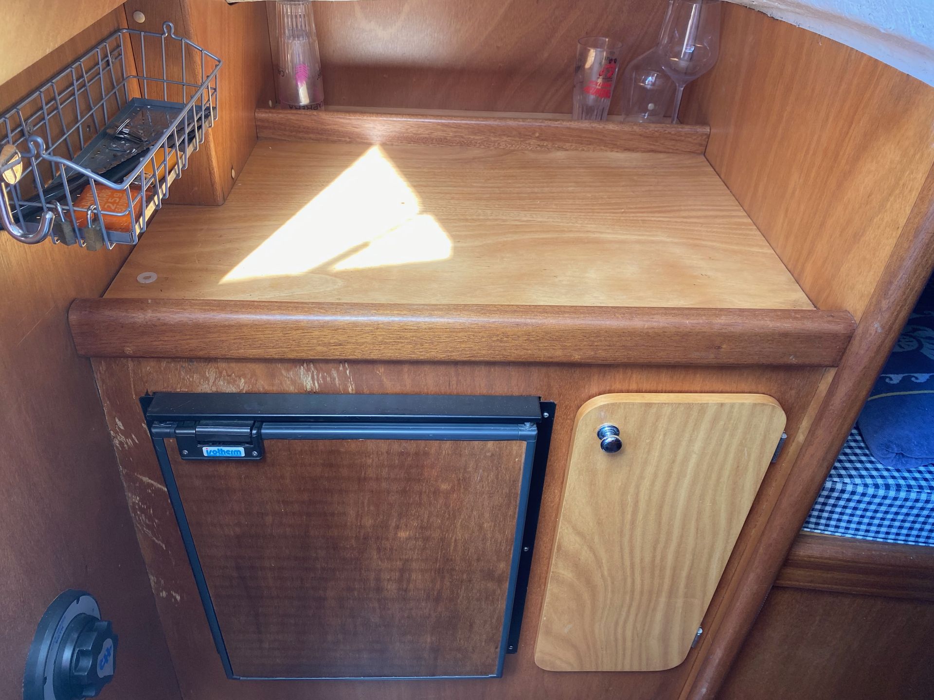 Stepping down into the console, you’ll find a practical layout: the toilet is conveniently located on the starboard side, while a pantry with fridge sits to port. Forward of this, the sleeping accommodation features a wide opening hatch to the foredeck, creating a bright and airy space.